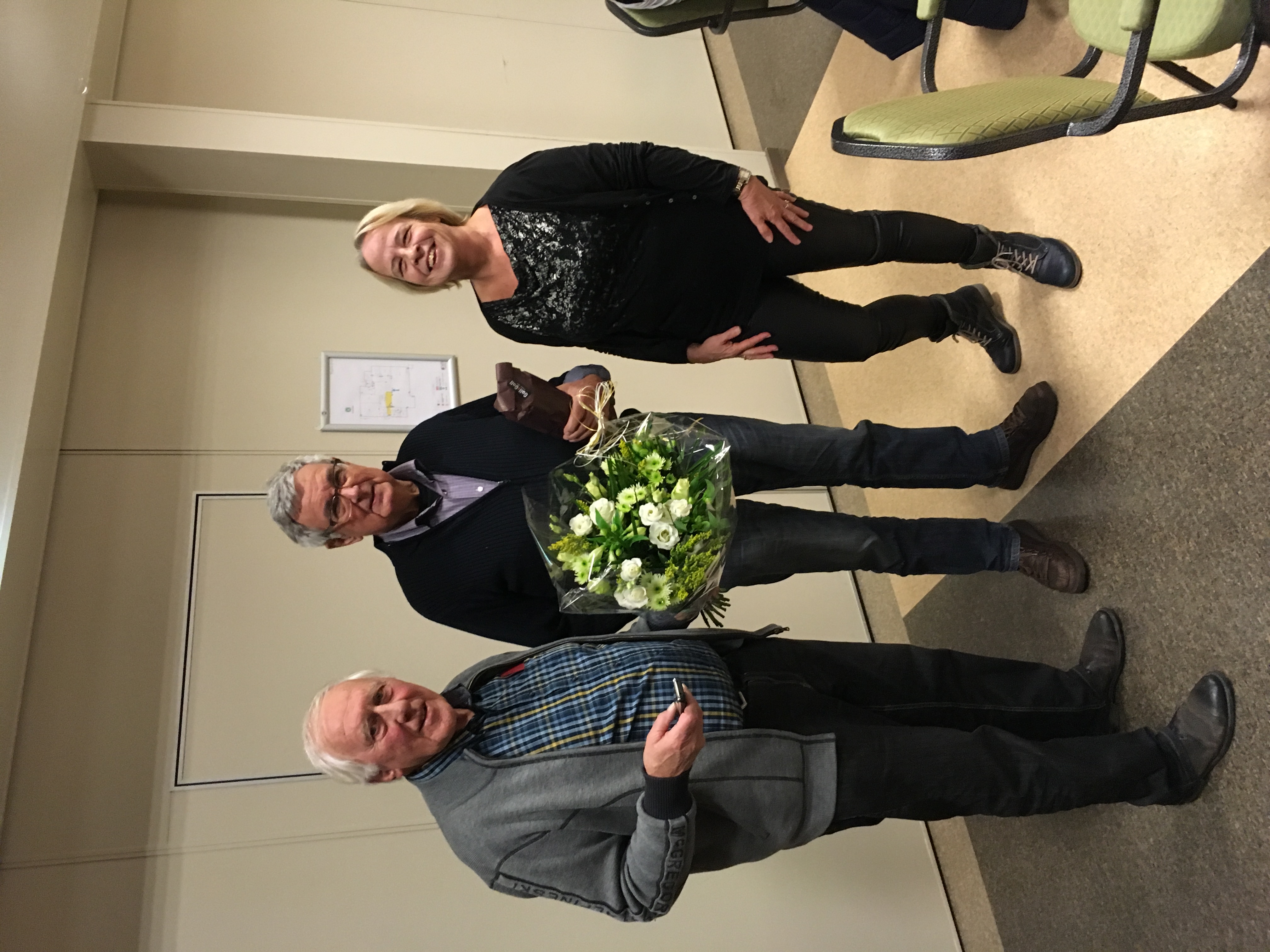 Onze voorstelling van zaterdagavond kreeg nog een feestelijk staartje. Na het dankwoord van onze voorzitter Martin, werden tot ieders genoegen drie leden naar voren geroepen. Jubilarrisen Gerda en Jamie (ruim) 25 jaar en Aukje 40 jaar kregen een onderscheiding opgespeld. Zij werden door Martin persoonlijk toegesproken en in het zonnetje gezet. Nadat hij klaar was met zijn lofzang en af wilde sluiten spoedde Piet Zwikker zich naar het toneel. Hoo, wacht! We hebben nog 'n jubilaris..., Martin van ’t Veer!